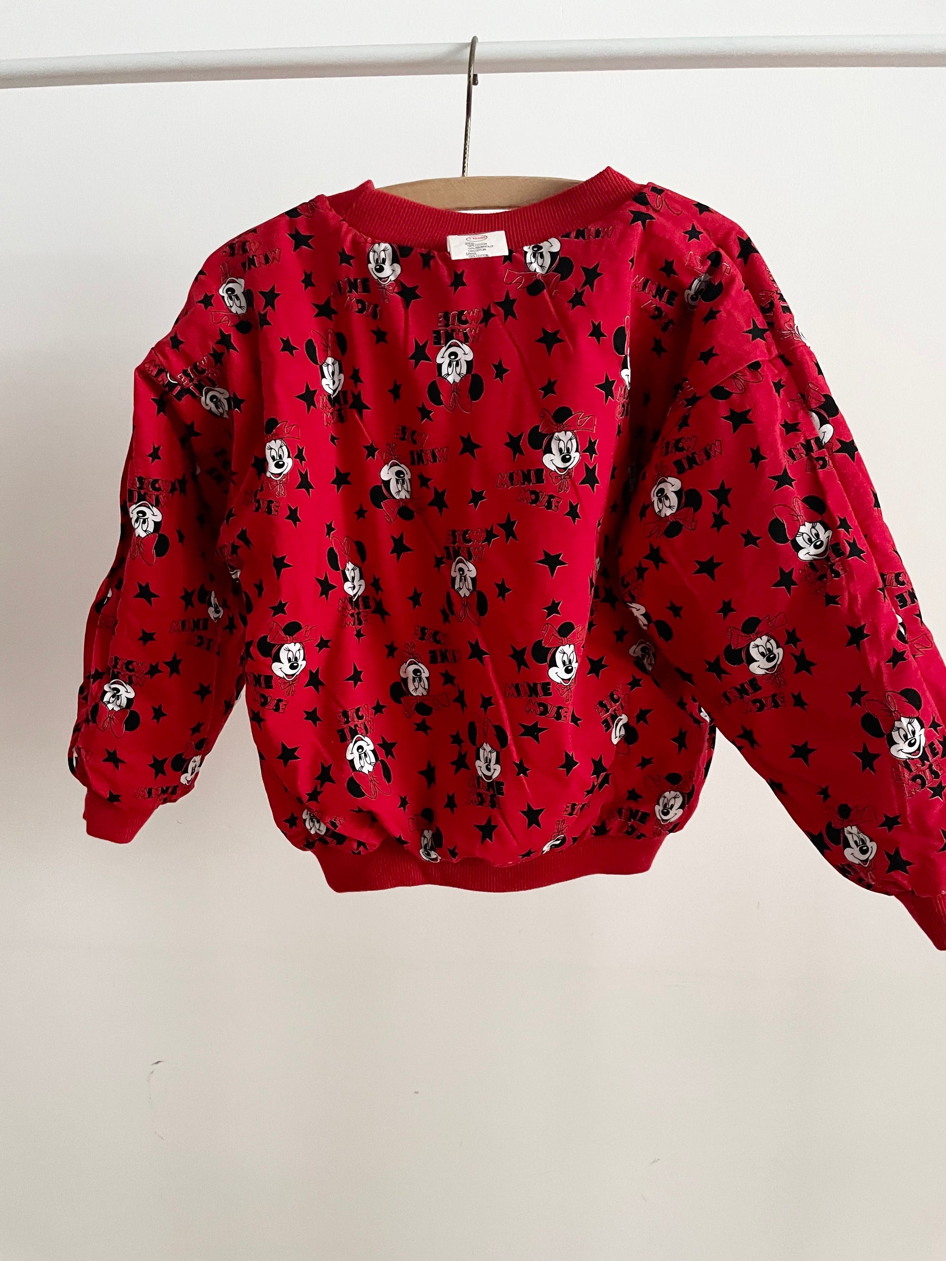 A padded reversible sweatshirt, one side red with a printed white front. The print is a 90’s skying version of Mickey and Minnie Mouse and it’s simply amazing. In the other side an all over print of Minnie.