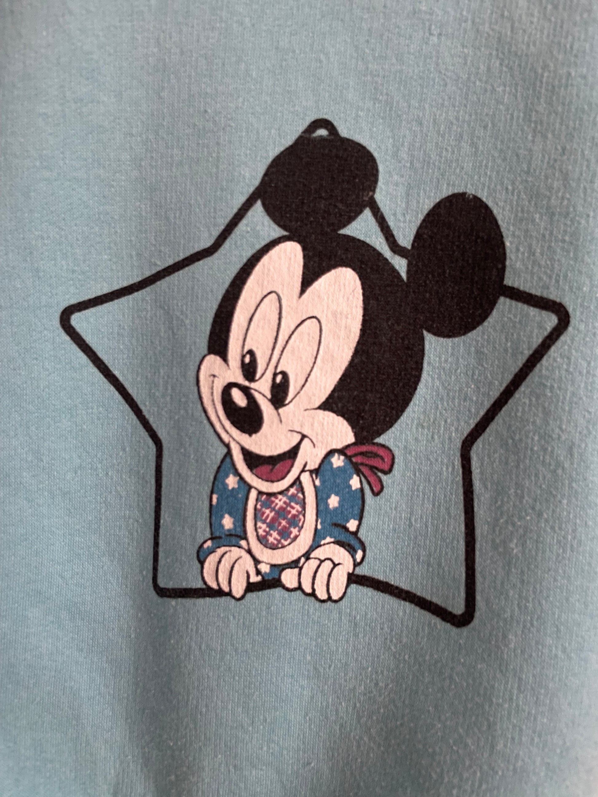 From 1991, a warm tracksuit, in a bright blue with white stars printed and a Baby Mickey print on the sweatshirt. Trousers have side pockets and cuffed ankle.