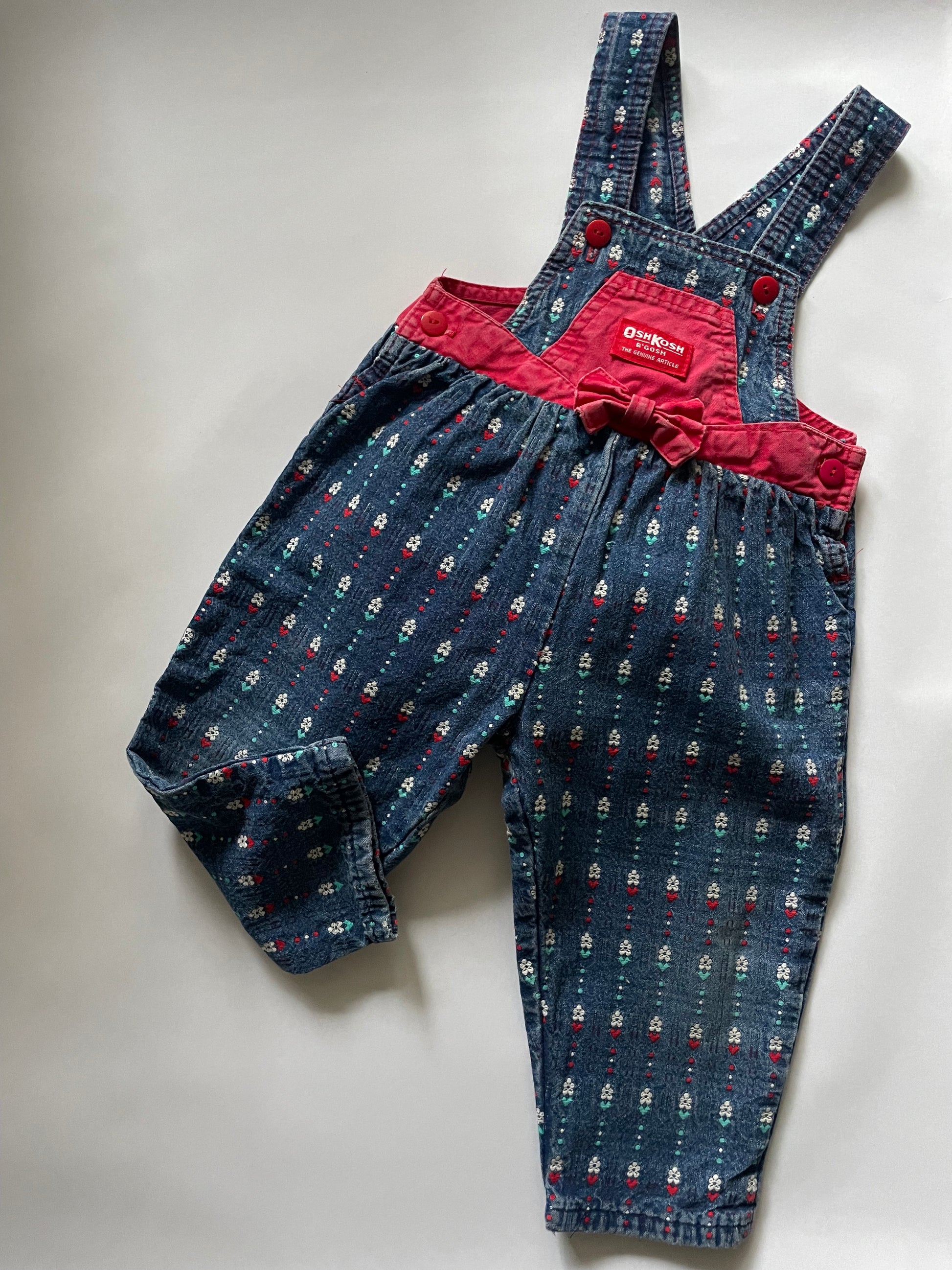 LOVE THESE! cutest little vintage Oshkosh overalls in denim woven fabric scattered with ditsy daisies and hearts and epic contrast red bow. Cute semi bubble shape. super soft and perfectly worn!